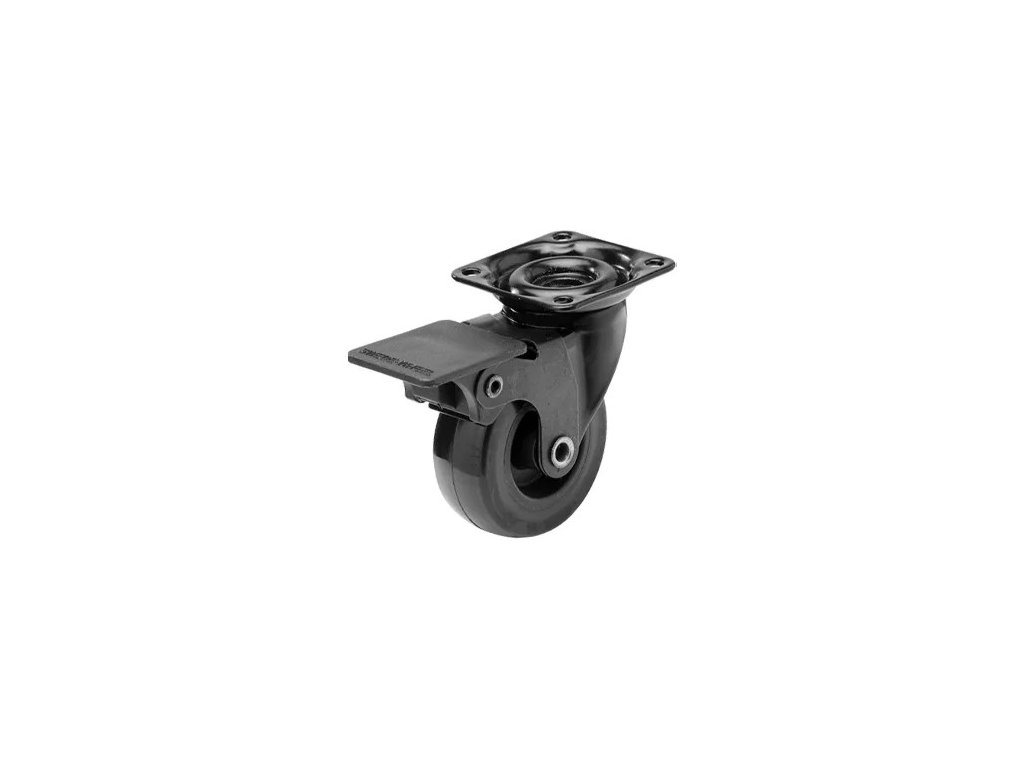 Otočné nábytkové koliesko s brzdou kolesa a s uchytením na platničku. Vidlica vyrobená z oceľového výlisku - lakovaná čiernou farbou. Stred kolieska vyrobený z polypropylénu, behúň vyrobený z polyuretánu, nitované