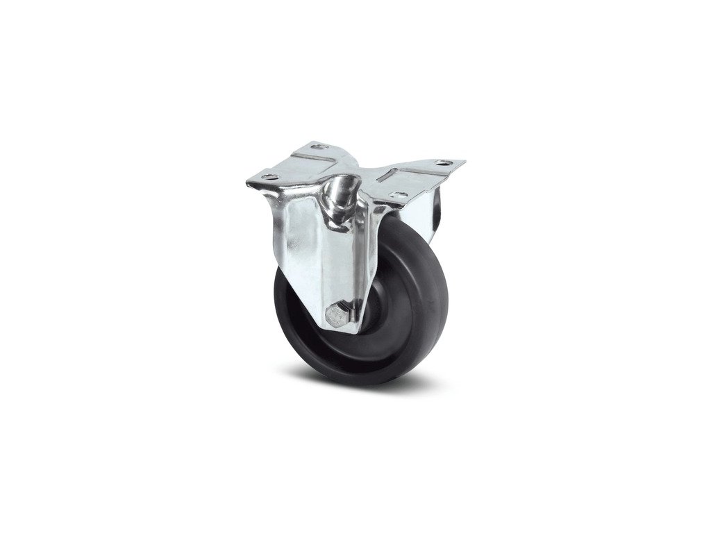 Pevné koliesko, vidlica vyrobená z nehrdzavejúcej ocele. Uchytenie na platničku. Koliesko vyrobené zo syntetického materiálu, odolávajúcemu vysokým teplotám. Klzné ložisko.